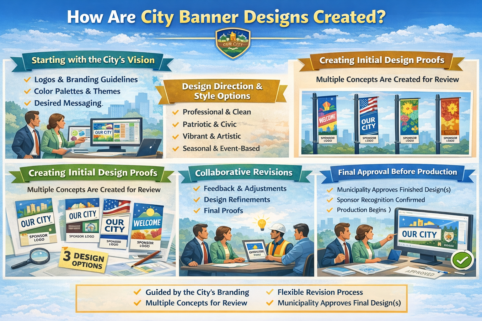 City banner designs are created through a collaborative process that combines municipal input, branding guidelines, and professional graphic design to produce visually cohesive and community-focused banner layouts.